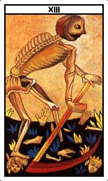 Cuando aparece sobre el tapete, a mucha gente le da un escalofrío. Es el Arcano Mayor XIII, la «Carta de la Muerte». Piensan que predice su muerte próxima, o quizás la de alguien cercano. Nada más lejos de la realidad. El decimotercer Arcano Mayor de la baraja del Tarot contiene, en efecto, una representación clásica de la Muerte bajo la forma de un esqueleto segando cuerpos con su guadaña. En la carta se ve como nadie puede evitar semejante destino: ni el rey, ni el pobre, cuyas cabezas y miembros yacen a sus pies. Al fondo, unos árboles esqueléticos evocan sequías e inviernos inacabables.
