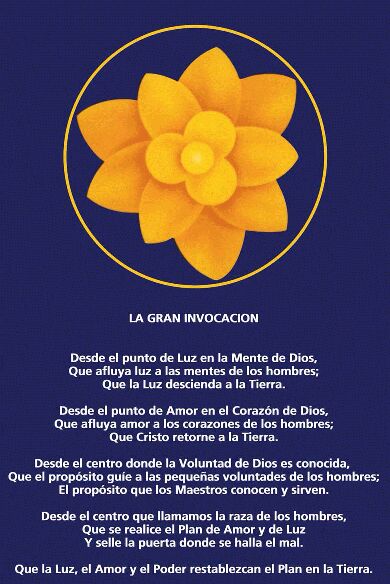 La Gran Invocación es una plegaria mundial traducida a más de 75 idiomas y dialectos. Es un instrumento de poder para ayudar a que tenga plena expresión el Plan de Dios en la Tierra. La belleza y la fuerza de esta Invocación reside en su sencillez y en que expresa ciertas verdades esenciales, que todos los hombres aceptan innata y normalmente: