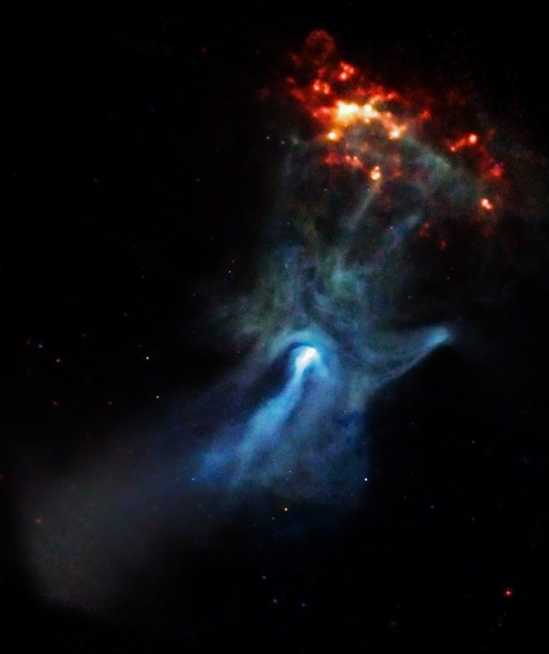 Este joven pulsar (cuerpo de neutrones), que se calcula se halla a una distancia de 17.000 años luz de la Tierra, es denominado PSR B1509. El núcleo de este cuerpo celestial tiene un diámetro de 12 millas, pero puede emitir en el espacio hermosos rayos X a una extensión de 150 años luz, como si realmente fuera la mano de Dios, enviándonos luz a todos nosotros.