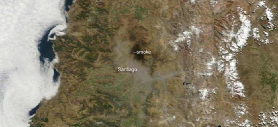 La NASA hizo pública ayer una foto captada por su satélite ‘Terra’, una vista desde el espacio que se ha convertido ya en un testimonio gráfico de gran valor: una inmensa nube de polvo y humo grisáceo y negro sobre Santiago de Chile, tomada justo después de producirse el violento terremoto del pasado sábado. Algunos edificios en la capital de Chile se incendiaron y el temblor que sacudió la tierra durante más de dos minutos completos también envió una nube de polvo al aire. En la imagen se aprecia un tremendo borrón gris y negro (‘smoke’) sobre la ciudad.