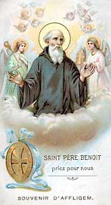 Oración: Oh glorioso san Benito, cuya alma, en tu dichosa muerte, fue elevada al cielo en medio de ángeles y de santos, siendo consolados tus discípulos por la revelación de tu gloria: consíguenos la gracia de la perseverancia final y de una buena muerte.