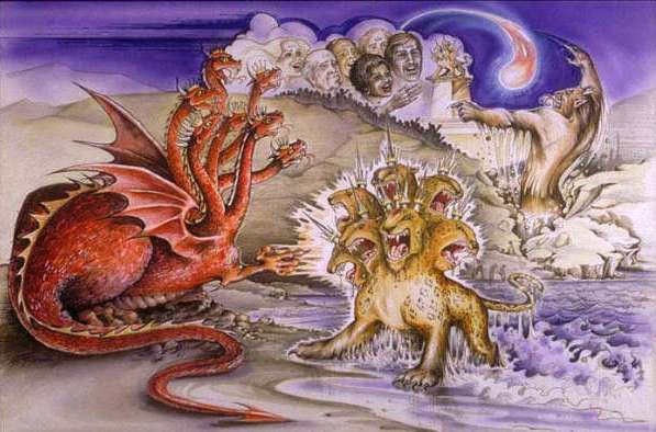 Ap. 17:12-14: Más claramente aún Juan, discípulo del Señor, escribió en el Apocalipsis acerca de los últimos tiempos y de de los diez reyes que se dividirán el reino que ahora impera. Cuando explica el significado de los diez cuernos que Daniel vio, dice que esto le fue revelado: “Y los diez cuernos que viste son diez reyes a los que aún no se les ha dado el reino, sino que por una hora recibirán el poder junto con la bestia. Estos tienen una sola idea en su mente, la de entregar a la bestia la fuerza y el poder. Estos lucharán con el cordero, y éste los vencerá porque es el Señor de los señores y Rey de los reyes.” También se declara que aquel que viene matará a tres de ellos, los otros le quedarán sometidos, y el mismo será el octavo de ellos. Y devastarán Babilonia y la quemarán a fuego, le entregarán su reino a la bestia y perseguirán la iglesia. Una vez acaecidas estas cosas, quedarán destruidos con la venida de nuestro Señor. Ireneo (180 d.C.)