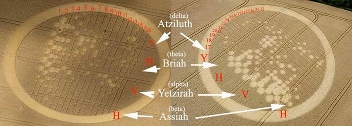 Interpretación cabalística de los círculos gemelos de Wickham, con las letras Iod, He, Vau, He (YHVH) que formarían el nombre de Dios, Jehovah.
