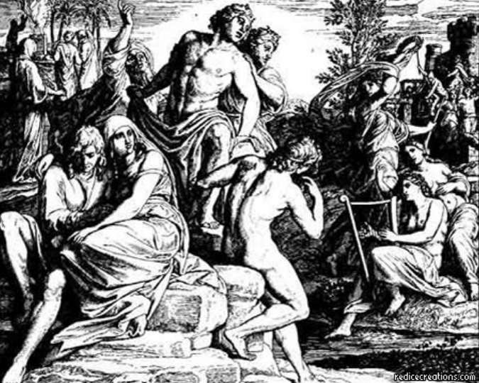 Grabado antiguo representando a los ángeles caídos uniéndose a las hijas de Adán. La palabra nefilim o nephilim proviene del hebreo que quiere decir los caídos y estos seres eran para la tradición judía y cristiana un pueblo de gigantes resultado de la unión entre los Grigori ( los ángeles caídos) y las hijas de Adán (primeros descendientes después de Adán y Eva).