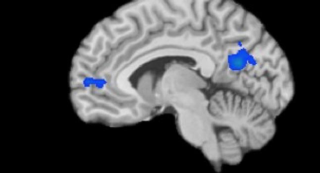 Los investigadores usaron imágenes de resonancia magnética funcional para determinar cómo el cerebro de los meditadores difería de los sujetos que no estaban meditando. Las zonas sombreadas en zonas de altas luces azules indican la disminución de la actividad en los cerebros de los meditadores. (Imagen Universidad de Yale).