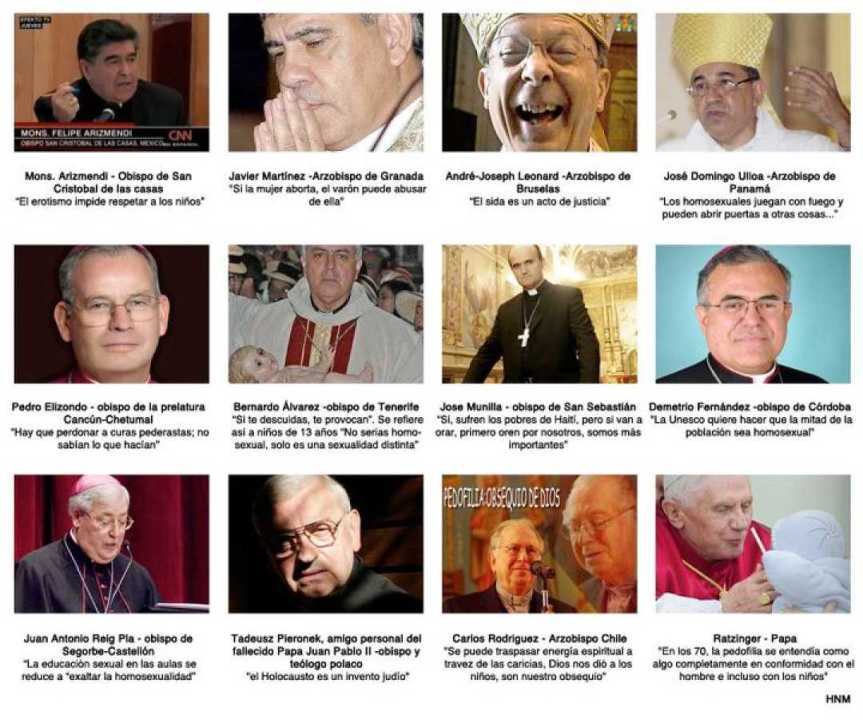 Nota importante.- Actualización.- Comentarios en Twitter nos han llevado a investigar un poco por nuestra cuenta. Hemos descubierto que ‘Monseñor Carlos Rodríguez’ es en realidad un perfil falso en Facebook, que ha llevado a la confusión no sólo a nosotros ahora, sino también anteriormente a varios medios de comunicación. En el listado de los arzobispos de Chile no aparece ninguno llamado Carlos Rodríguez, y pedimos por ello disculpas públicas a quien corresponda. Ello no quita que el cura pedófilo chileno Fernando Karadima sí sea muy real, y todo el daño que hizo a muchísimas personas, también es verídico. Asimismo son reales los 11 religiosos restantes que aparecen en las fotos, como lo son sus declaraciones.