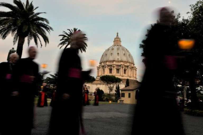 Obispos ante la cúpula de San Pedro, en el Vaticano