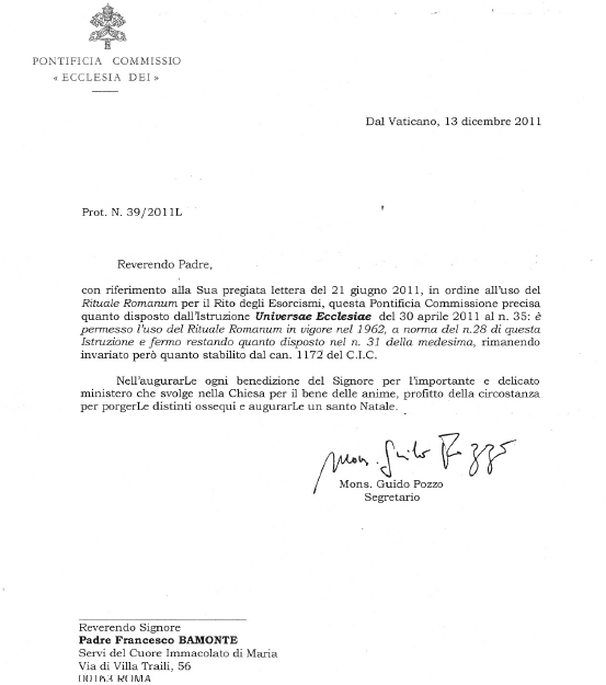En una carta fechada en el Vaticano el 13 de diciembre de 2011, el secretario de la Pontificia Comisión Eclessia Dei, monseñor Guido Pozzo, responde afirmativamente a la consulta efectuada por el padre Francesco Bamonte, exorcista de la Diócesis de Roma, sobre la posibilidad de emplear el Rituale Romanum “en vigor en 1962”, que era precisamente el de Paulo V, cuya última edición corresponde a 1952.