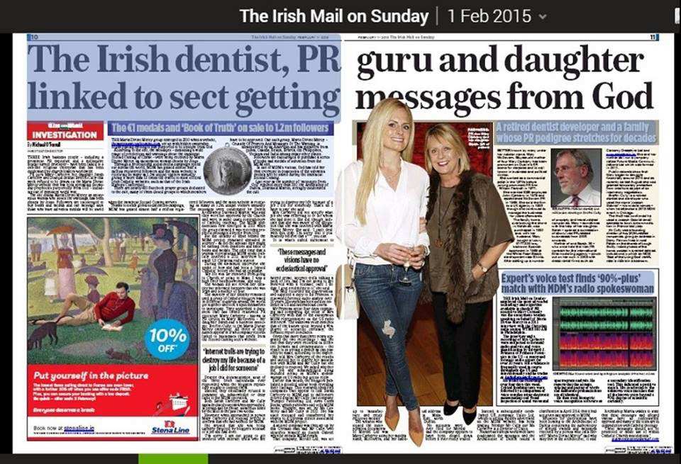El periodista del Irish Mail on Sunday Michael O’Farrell expuso a los personajes centrales detrás de lo que llamó el “fraude de María de la Divina Misericordia”, que era el equipo de relaciones públicas formado por madre e hija –María y Sara Carberry– y el millonario dentista retirado Breffni Cully. Esta fue la primera exposición en los principales medios de comunicación de la exitosa operación comercial.