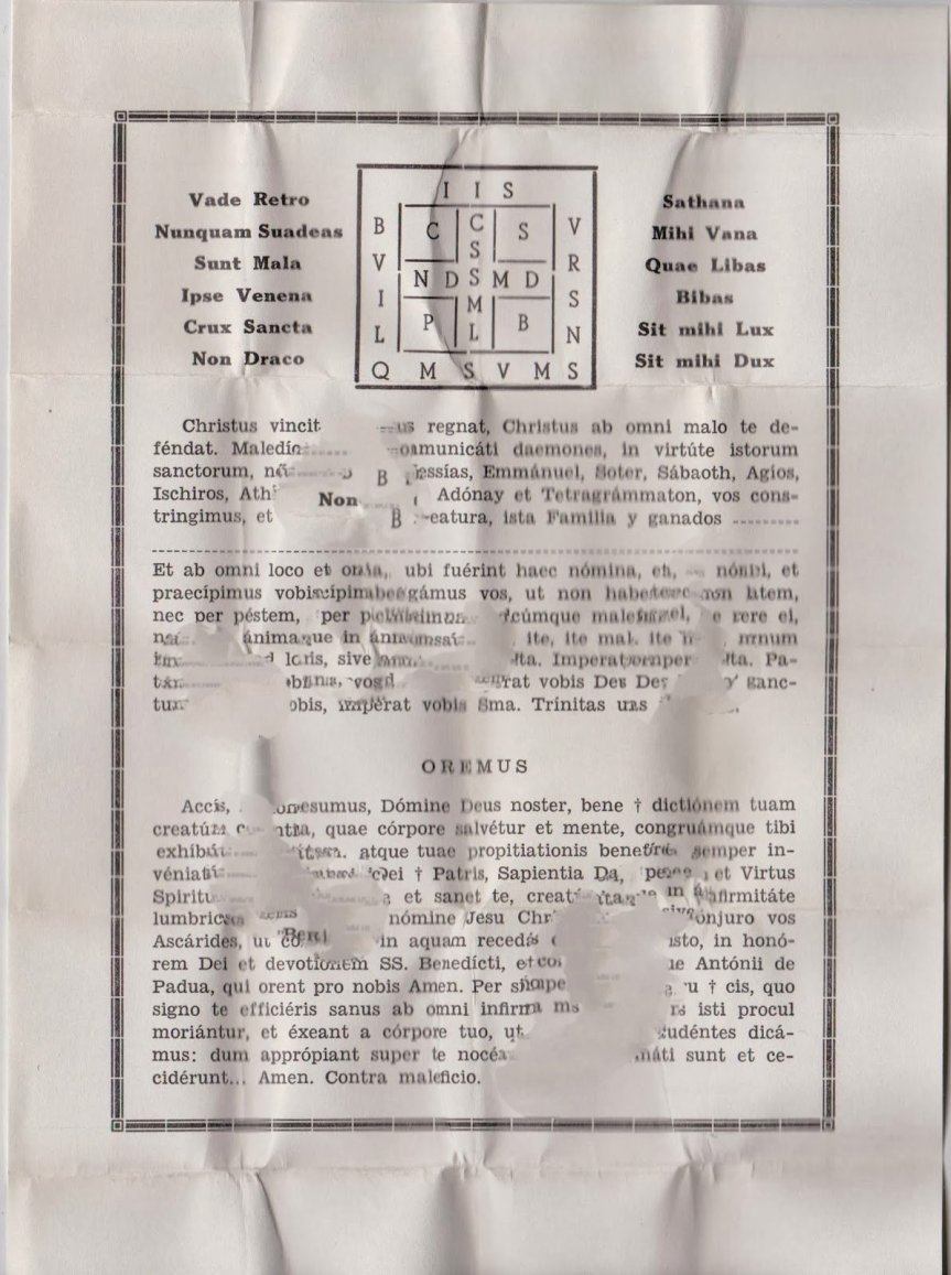 Sigue el conjuro ocho líneas más y acaba con una oración. En la página impresa en latín se reproduce el reverso de la cruz de San Benito, de quien toma el nombre la cartilla. Y dice así: “Vade Retro Sathana/ Nunquam Suadeas Mihi Vana/ Sunt Mala Quae Libas/ Ipse Venena Bibas/ Crux Sancta Sit mihi Lux/ Non Draco Sit mihi Dux”. En pleno siglo XXI aún podemos encontrarnos con estas invocaciones y rezos para ahuyentar al mismísimo Satanás. Terrorífico.