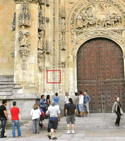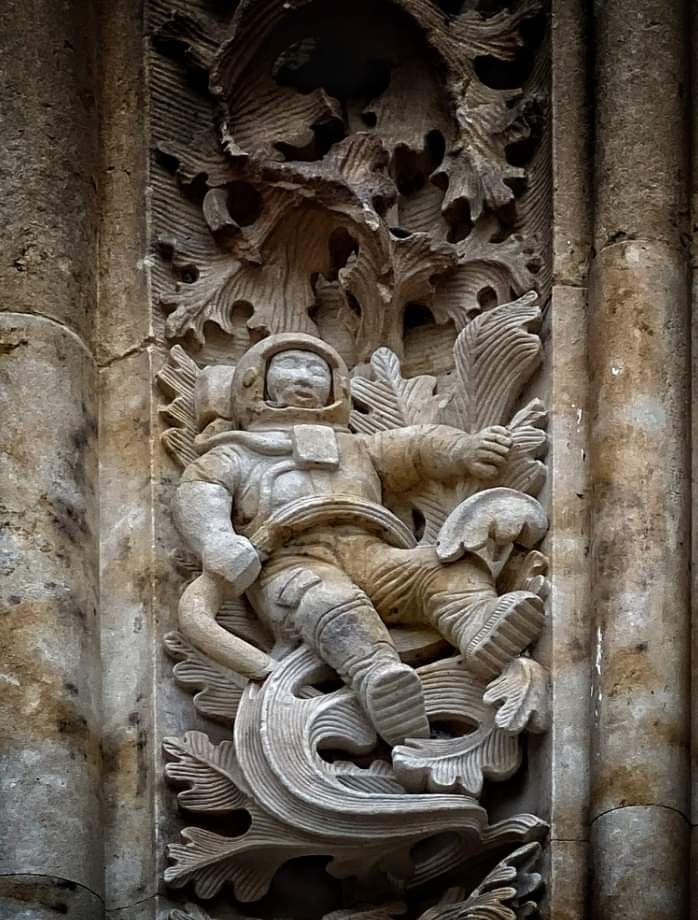 Una pequeña escultura tallada en una de las portaladas de la Catedral Nueva de la ciudad de Salamanca llama la atención de cientos de transeúntes y turistas por su peculiar forma de astronauta, en un edificio que fue construido entre los siglos XVI y XVIII.