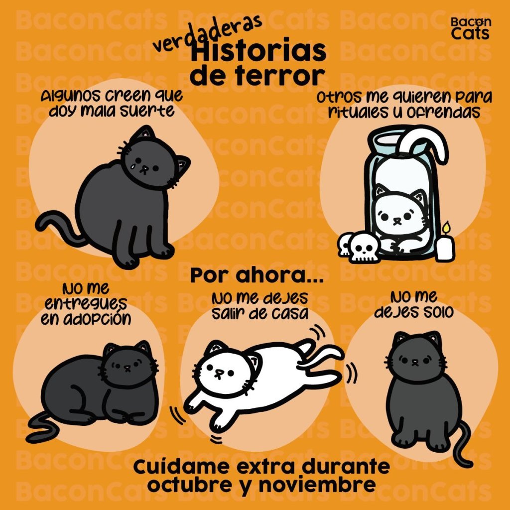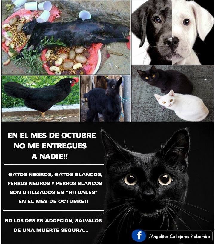 Animalistas consultados por TLI hacen énfasis en recomendar no dar en adopción durante todo este mes de octubre a gatos completamente blancos o negros, porque Halloween (Todos los Santos y Día de Difuntos) son fechas muy vinculadas a los ritos y los gatos de estos colores tienen una “simbología especial”, siendo utilizados como sacrificio de sangre en ritos satánicos”. «Son sacrificios de sangre -nos cuentan- que forman parte de creencias populares y arcaicas sin ningún sentido, que lo único que consiguen es sacrificar a un animal que lo único que busca es una familia que le quiera”.