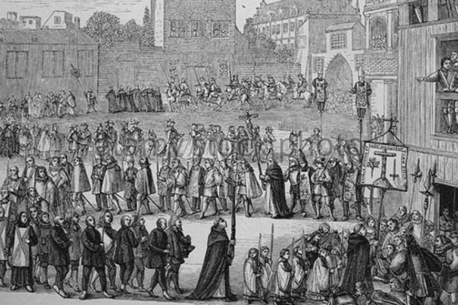 Este Auto de la Fe es de las cosas mas notables que se han visto en muchos años, porque á él concurrió gran multitud de gente de todas partes de España y de otros reinos; y sábado 6 dias del mes de noviembre se comenzó el Auto con una muy lucida y devotísima procesion, en que iban, lo primero, siguiendo un rico pendon de la cofradía del santo Oficio, hasta mil familiares, comisarios y notarios de él, muy lucidos y bien puestos, todos con sus pendientes de oro y cruces en los pechos. Después iba gran multitud de religiosos de las órdenes de Santo Domingo, San Francisco, la Merced, la Santísima Trinidad y la Compañía de Jesus, de los cuales hay conventos en la dicha ciudad; y para ver el dicho Auto, de todos los monasterios de la comarca había acudido tanta multitud de religiosos, que vino á ser tan célebre y devota esta procesion como jamás se ha visto. Al cabo de ella iba la Santa Cruz verde, insignia de la Inquisicion, que la llevaba en hombros el guardián de San Francisco, que es calificador del santo Oficio, y delante iba la música de cantores y ministriles, y cerraban la procesion dos dignidades de la Iglesia colegial y el alguacil del santo Oficio con su vara, y otros comisarios y personas graves, ministros del santo Oficio, que todos en muy buen órden llevaron á plantar la Santa Cruz en lo mas alto de un gran cadalso de ochenta y cuatro piés en largo y otros tantos en ancho, que estaba prevenido para el Auto, y con vistosos faroles y familiares de guarda estuvo toda la noche, hasta que el dia siguiente, luego que amaneció, salieron de la Inquisición. Lo primero, cincuenta y tres personas que fueron sacadas al Auto en esta forma: Veinte y un hombres y mujeres que iban en forma y con insignias de penitentes, descubiertas las cabezas, sin cinto y con una vela de cera en las manos, y los seis de ellos con sogas á la garganta, con lo cual se significa que habian de ser azotados. Luego se seguian otras veinte y una personas con sus sambenitos y grandes corozas con aspas de reconciliados, que también llevaban sus velas en las manos, y algunos sogas á la garganta. Luego iban cinco estatuas de personas difuntas con sambenitos de relajados, y otros cinco ataudes con los huesos de las personas que se significaban por aquellas estatuas. y las últimas iban seis personas con sambenito y corozas de relajados, y cada una de las dichas cincuenta y tres personas entre dos alguaciles de la Inquisicion, con tan buen órden y lucidos trajes los de los penitentes, que era cosa muy de ver. Tras ellos iba, entre cuatro secretarios de la Inquisicion en muy lucidos caballos, una acémila, que en un cofre guarnecido de terciopelo llevaba las sentencias; y en lo último iban á caballo los señores inquisidores doctor Alonso Becerra Holguin, licenciado Juan de Valle Alvarado, y licenciado Alonso Salazar y Frias, llevando en medio al mas antiguo, acompañados del estado eclesiástico al lado derecho, y de la justicia y regimiento al lado izquierdo, y un poco delante iba en medio de la procesion el doctor Isidoro de San Vicente con el estandarte de la Fe, puestos en muy buen orden, que representaba todo grande autoridad y gravedad.