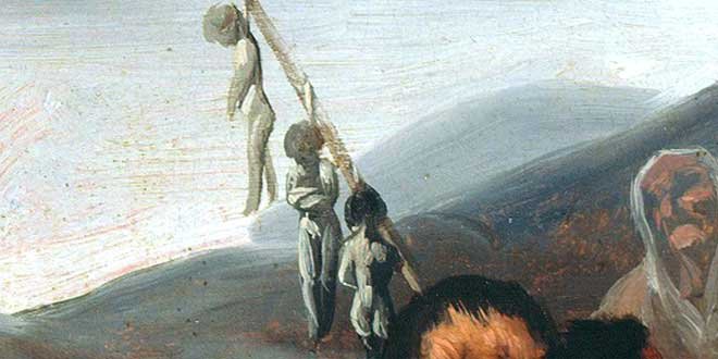 A la izquierda cuelgan de un palo varios niños. Parecen demacrados y esqueléticos, lo mismo que los dos que están en el suelo. Los inquisidores hicieron confesar a las «brujas» que los chupaban por el ano y los genitales (sieso y natura) hasta la muerte.
