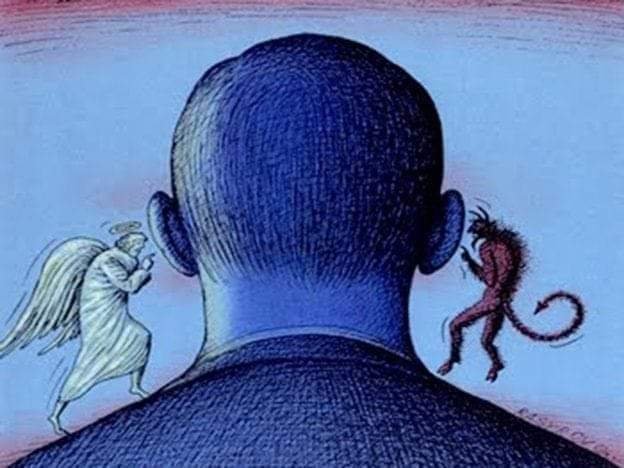Y así, ángel y demonio pugnan, a lo largo de toda la vida del ser humano, por hacerse dueños de sus decisiones. El hombre nace libre para decidir. El demonio es libre de tentar. La decisión última de caer o redimirse, siempre está en la conciencia humana, en el gran regalo que hizo Dios al ser humano: el libre albedrío.