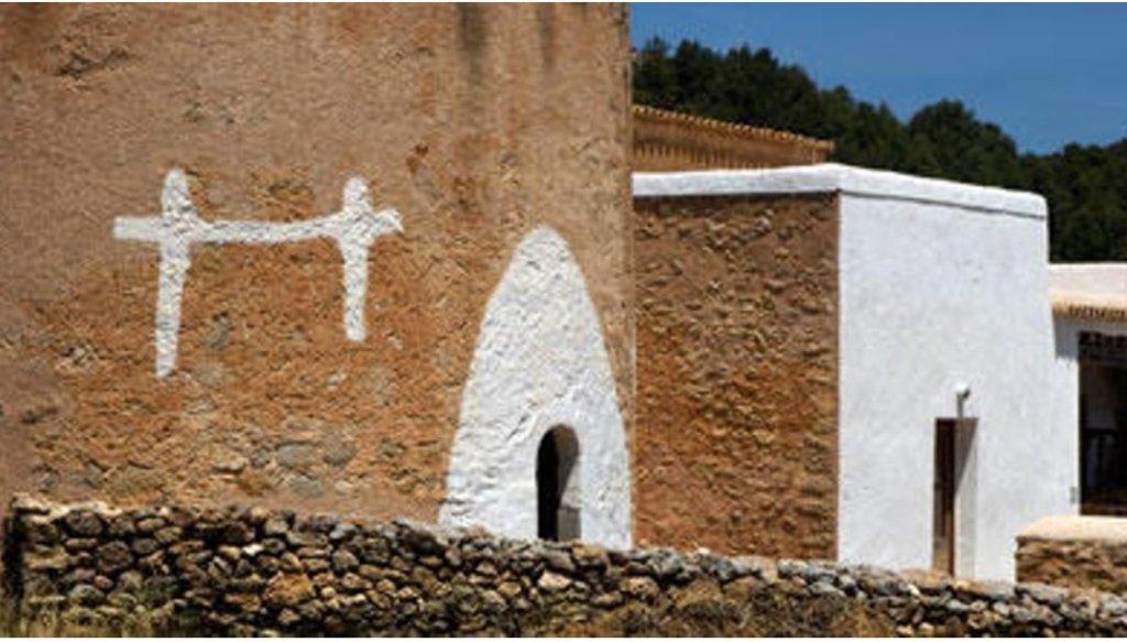 Los símbolos para conjurar espíritus malignos son prácticamente universales, pero la forma perfecta con la que las cruces de cal blanca armonizan con la arquitectura rural pitiusa han propiciado que se conviertan en elementos característicos de las antiguas casas payesas. En sus fachadas, junto a las ventanas o en las torres de refugio, las cruces de cal aluden a un lenguaje mágico y simbólico que puede remontarse al Paleolítico. Al menos tal antigüedad le asignan diversos autores y a ellos se remiten los arquitectos Ferdinand Joachim y Philippe Rotthier en su obra ´Eivissa, el palau pagès´.
