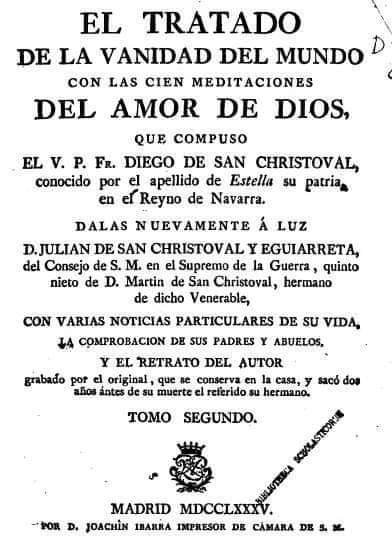 Nota.- Este fragmento es de un libro que leí y releí en mis años de Seminario y del cual tengo la fortuna de conservar un ejemplar en mi biblioteca. Se trata de la obra «El Tratado de la Vanidad del Mundo, con las Cien Meditaciones del Amor de Dios». Autor Diego de San Cristóbal. Impreso en Madrid, 1785.
