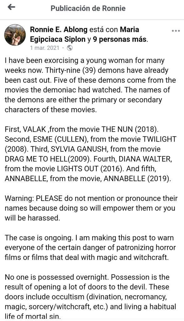 Se puede leer en ese mensaje de Facebook que publicó el sacerdote exorcista que está en un exorcismo activo a una joven y que le ha expulsado 39 demonios. De estos 39 demonios, el sacerdote afirma que 5 demonios provienen de películas de terror.