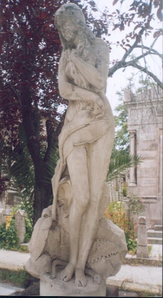 Una estatua repleta de simbolismo.- Muy pocos visitantes se fijan en ella, y menos todavía se paran a observarla detenidamente. Podemos añadir que pasa prácticamente desapercibida, en un rincón cualquiera del inmenso recinto. Pero para nosotros tiene un enorme simbolismo, un gran significado. Esta estatua, aunque lamentablemente deteriorada por el paso del tiempo, las inclemencias meteorológicas y también por la desidia y la indiferencia, se encuentra en el Cementerio General de Santiago y representa a nuestra madre primigenia, Eva, pisando a la Tentadora Serpiente. Y al mismo tiempo, para nosotros simboliza el principal objetivo del Templo de la Luz Interior.